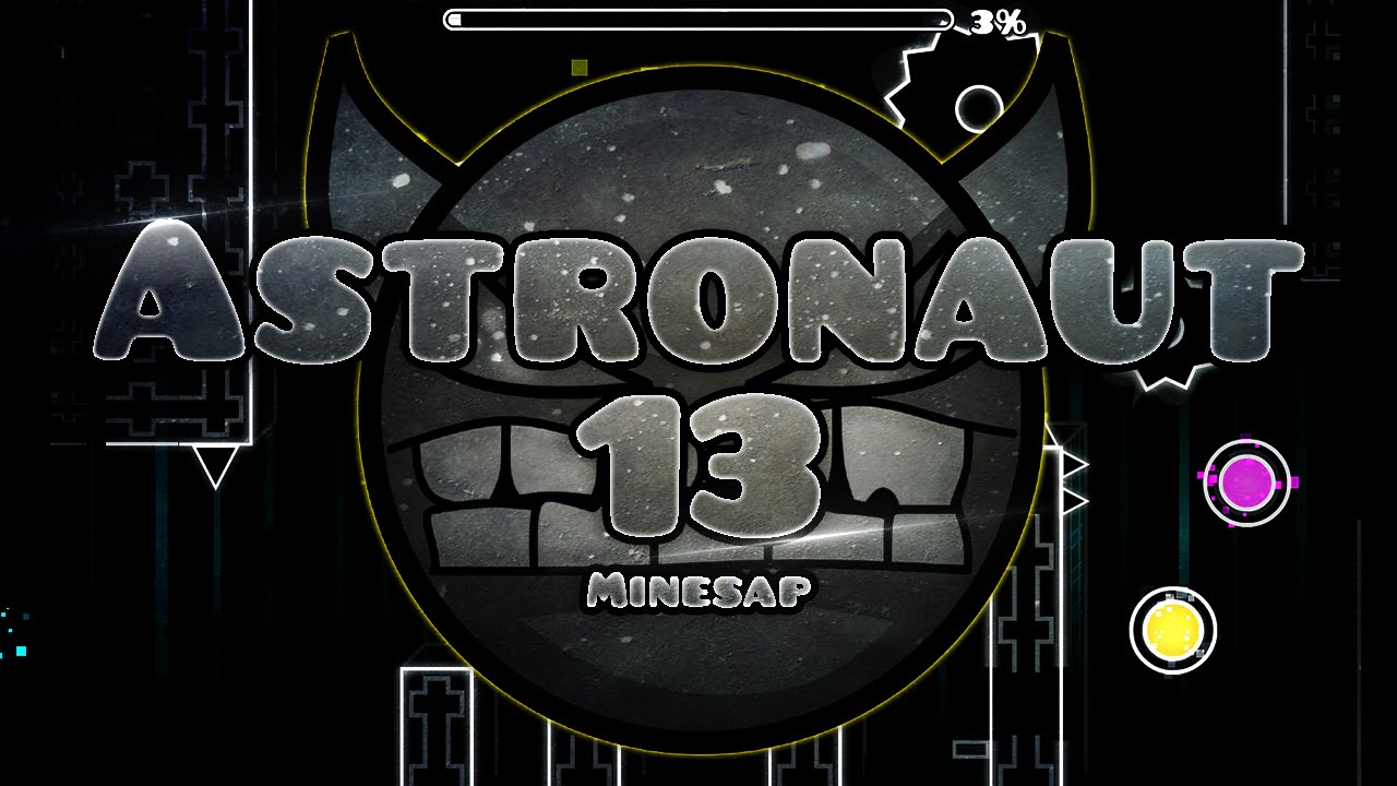 Geometry Dash Astronaut 13 is a solo Hard Demon level rated 10 stars created, verified, and published by Minesap. It's a challenging recreation of Nine Circles. This level's greatest distinguishing characteristic is its continual use of artificial lines and dark colors, making it incredibly difficult to see where the player is going.