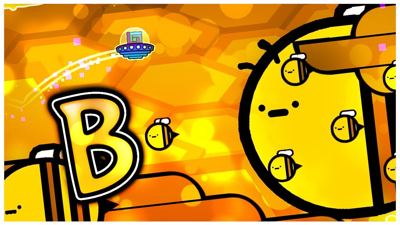 Geometry Dash B is a Medium Demon collaboration level bee themed rated 10 stars and 2 user coins, created by Motleyorc and ScorchVx and published by Motleyorc. It is a bee-themed level in yellow and brown, featuring beehive-like patterns and a boss battle against a huge bee.