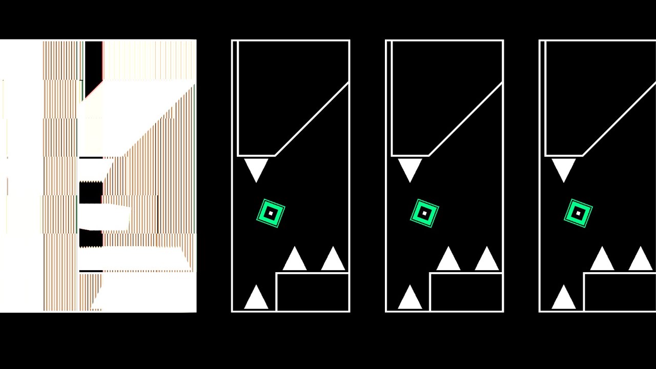 The speed accelerates again to the third level, transforming the character into a UFO. In this section, you'll experience a change in gravity. Afterward, there's a short double ball stage that requires two clicks, followed by a small UFO segment and a cube where gravity changes twice. Then, you navigate a quick little ball section, moving from one platform to another while facing obstacles. The ball then grows in size. Next, you navigate around spiked pillars on a boat, followed by two clicks on a short cube, and another ship section, this time upside down and more complex. The final stage involves a double cube, where you jump from block to block using spheres. The character slows down, and an automatic part follows.