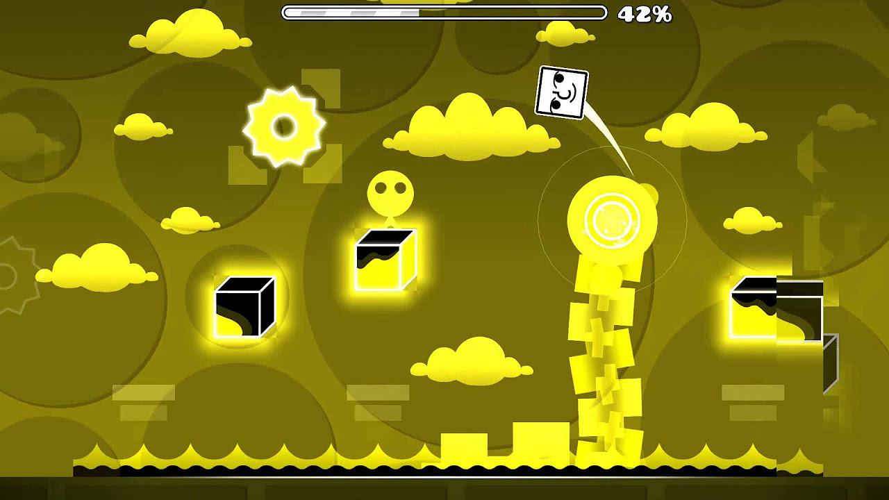 The cube stage returns, with screen rotations and careful jumps on blocks to avoid spikes. Next, you'll face a wave stage, gliding through a jagged tunnel. In the double UFO stage, precise jumps near the blocks are required. To proceed to the cube stage again, you must avoid hitting the spiked wall. The cube stage involves jumping on ladders before transitioning back to the wave stage, where you slide around the figures. Finally, you'll face the last stage as a ship, flying through a spiked tunnel.