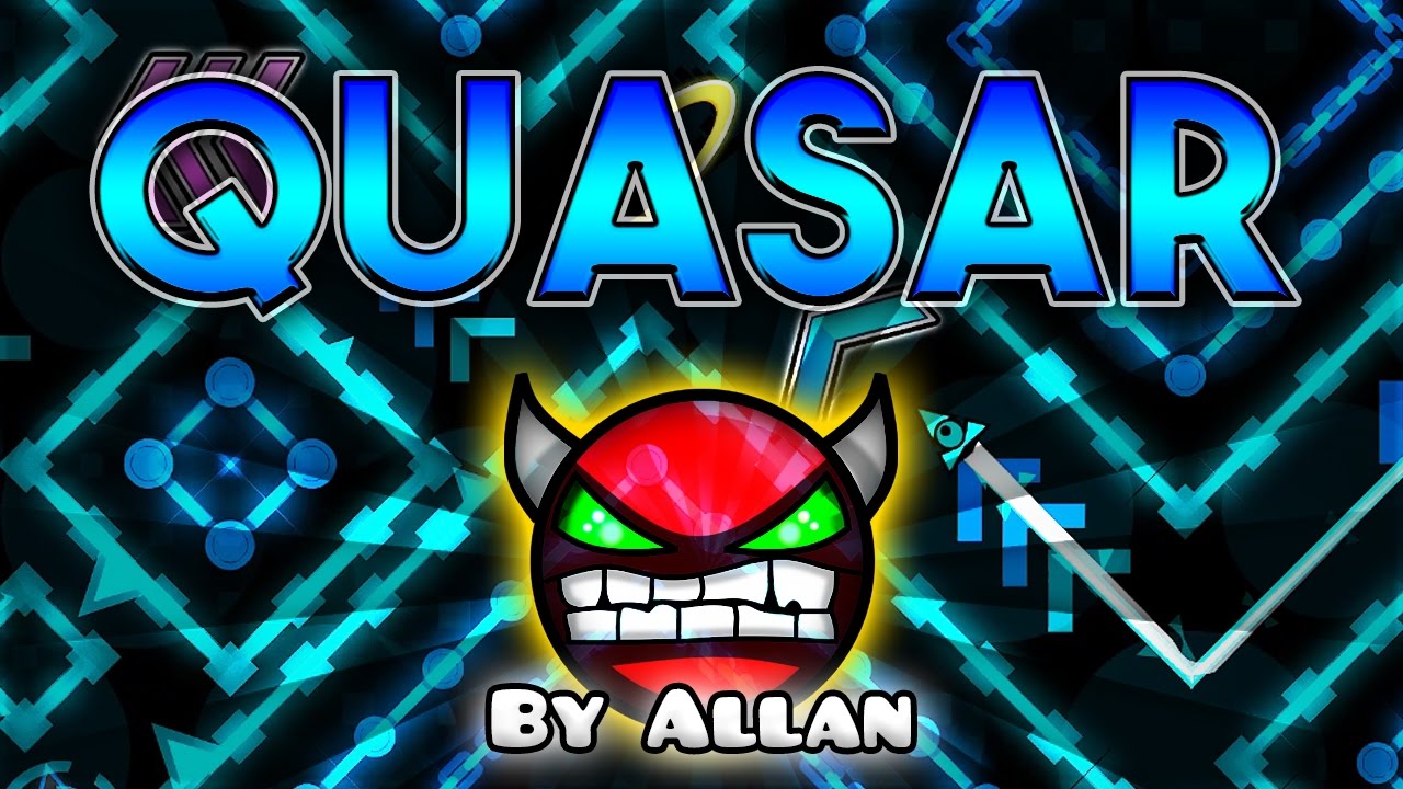 Geometry Dash Quasar is a Hard Demon level rated 10 stars created by Allan. Despite its community classification, it is a recreation of Nine Circles with an indigo color scheme and is regarded an Easy or Medium Demon by the designer. This level is regarded as one of the greatest and most distinctive Nine Circles levels. The level incorporates Update 2.0 aesthetics and effects into the 1.9 Nine Circles style, replacing many of the slanted blocks in the wave area with tiered backdrop decorations and invisible colliders.