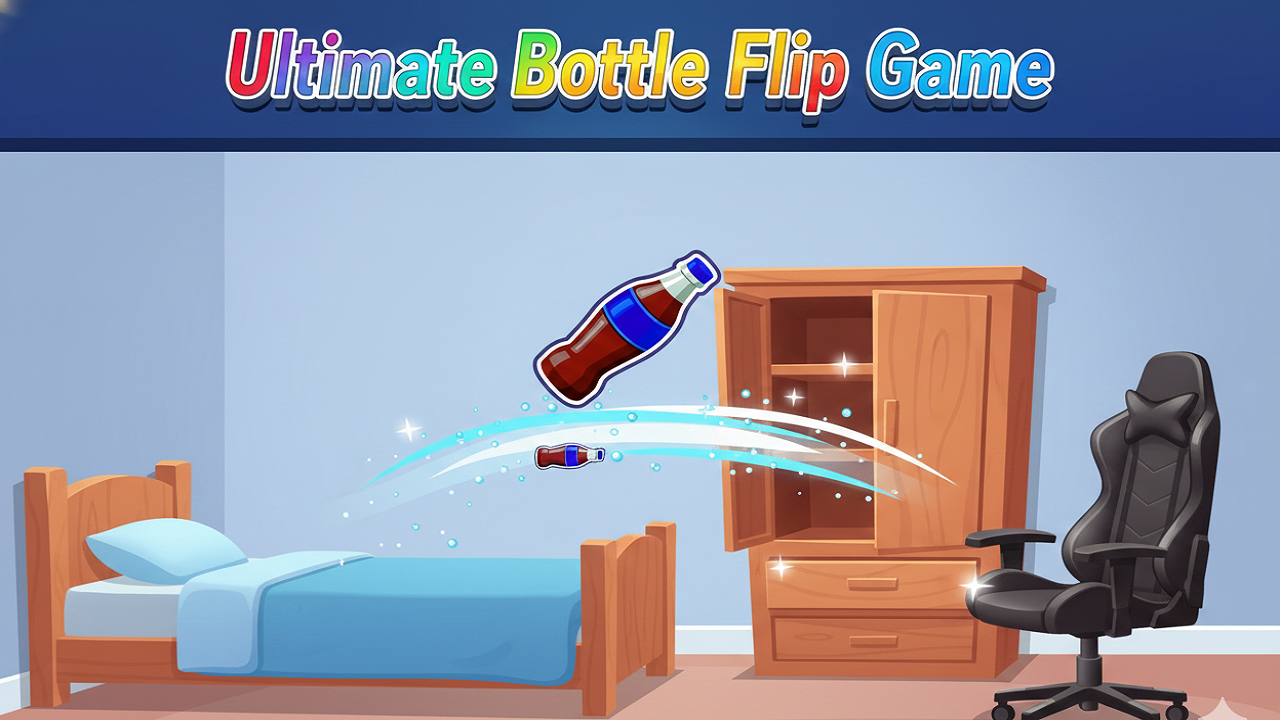 Ultimate Bottle Flip Game is a 3D skill game that takes you on a dramatic obstacle course with the main character being a familiar Coca-Cola bottle. The game scene takes place in a familiar bedroom, where there is a table, a chair, and a bed, and all of them will become parkour terrain for the bottle to perform spectacular flips.